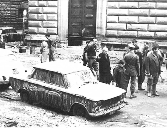 Vale destacar que monumentos, obras de arte e acervos bibliográficos foram soterrados na lama, incluindo a Biblioteca Nazionale de Florencia (Alentejo, 2023, p. 215). Nesse evento, civis tentaram amenizar os problemas causados pelas cheias, incluindo uma multidão de jovens voluntários de várias nacionalidades, chamados “os anjos da lama”, atuando desde o salvamento de pessoas quanto dos artefatos da memória artística e bibliográfica do berço do Renascimento: